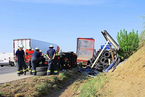 Der mit Autoreifen vollbeladene Anhänger wurde dabei so stark deformiert, dass ein Großteil der Ladung herausflog.