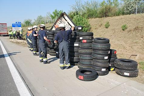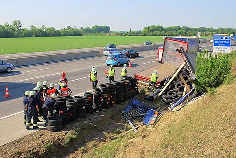 Deshalb musste zur Unterstützung die Feuerwehr Guntramsdorf nachalarmiert werden. Händisch sammelten die Feuerwehrmänner die Autoreifen zusammen und schlichteten diese am Pannenstreifen.