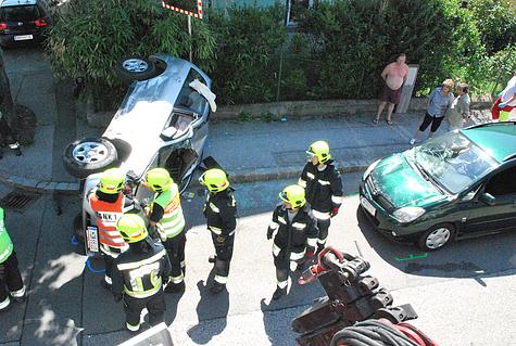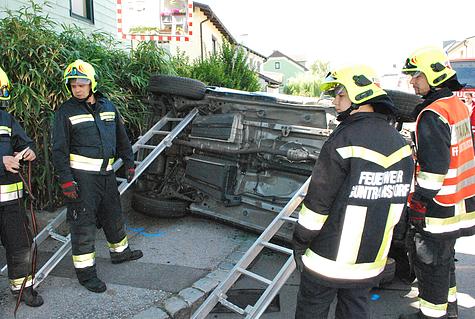 Mittels zwei Steckleiterteilen sicherte die Feuerwehr den seitlich liegenden Wagen. Ein Feuerwehrkamerad kletterte in das Fahrzeuginnere und betreute die Frau. Parallel dazu wurde ein Brandschutz aufgebaut.