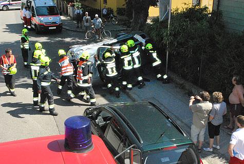 Dabei kippte ein PKW seitlich um und eine 71jährige Frau war in diesem Fahrzeug eingeklemmt.