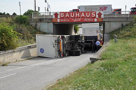 Aus bisher unbekannter Ursache stürzte der Anhänger eines LKW-Gespanns am Vormittag des 21. August 2012 im Industriezentrum Niederösterreich Süd nach einer Rechtskurve um.