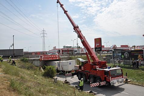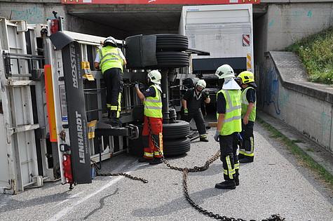 Am Unfallort angekommen, wurde durch den Einsatzleiter HBI Walter Wistermayer entschieden, dass eine rasche Bergung aufgrund der engen Platzverhältnisse in der Unterführung nur mit Hilfe eines Kranfahrzeuges erfolgen kann.