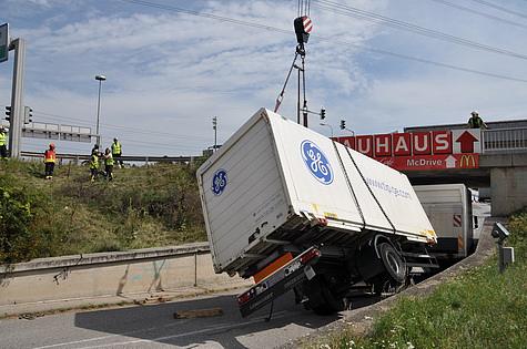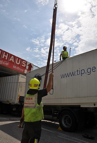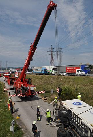 Nur durch das abgestimmte Zusammenspiel des Kranfahrers mit den Männern am Greifzug konnte der Anhänger rasch und sicher zurück auf die Räder gehoben werden. Nach einer kleinen Reparatur an der Druckluftanlage konnte das LKW- Gespann die Fahrt von alleine fortsetzen.
