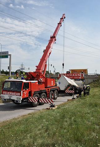 Umgestürzter LKW - Anhänger erfordert Kraneinsatz
