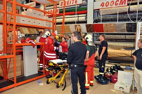 Nach Stabilisierung des Verletzten und nach Rücksprache mit dem Notarzt wurde das Hochregal mit einer Nussratsche behutsam geöffnet. Binnen wenigen Augenblicken konnte so der Mann aus seiner misslichen Lage befreit werden.