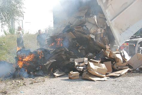 Durch die Dichtheit der zusammengepressten Kartonagen musste der Container geöffnet und entleert werden. Dazu wurde ein Firmenfahrzeug des Entsorgungsunternehmens hinzugeholt.