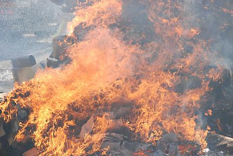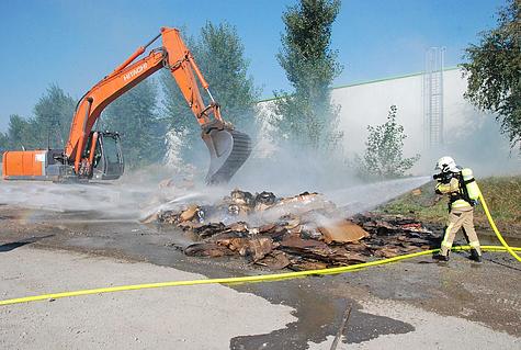 Glücklicherweise befindet sich genau gegenüber ein brachliegendes Grundstück. So konnten die rund 3t Kartonagen ausgeleert und abgelöscht werden. Um etwaige Glutnester ablöschen zu können, wurde der zufällig anwesende Bagger zum Zerteilen zur Hilfe geholt.