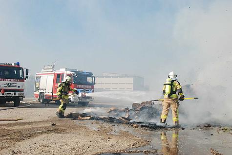 Bei der Ankunft in der Autoallee drangen bereits dichte Rauchschwaden aus dem Presscontainer. Sofort wurde unter Atemschutz ein C-Rohr zur Brandbekämpfung in Stellung gebracht. Die Wasserversorgung wurde über einen Hydranten sichergestellt.