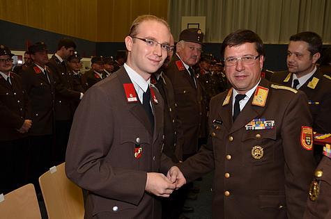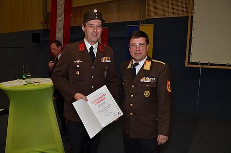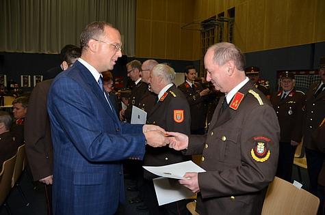 Zum Abschluss des Bezirksfeuerwehrtages 2. Teil ernannte Bezirksfeuerwehr-kommandant LFR Ing. Richard Feischl, Herrn Dipl.-Ing.(FH) Gregor Jänin, MSc von der Feuerwehr Gumpoldskirchen zum Feuerwehrtechniker. Weiters wurde Ehrenbrandmeister Werner Satra der Feuerwehr Wiener Neudorf zum Abschnittssachbearbeiter Feuerwehrgeschichte ernannt.