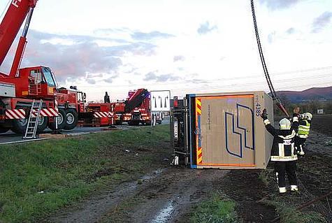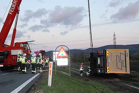 Der Lenker des 16,6 t Lastwagens kam von der Straße ab, geriet ins Bankett und stürzte anschließend in den Graben. Der LKW kam seitlich auf der Beifahrerseite zum Liegen. Die verletzte Person wurde vom Roten Kreuz versorgt.