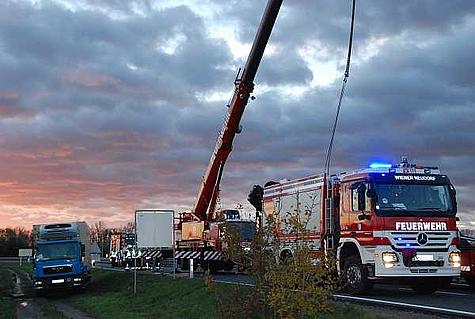 Nachdem die Kranmannschaft die Hebebänder am LKW angebracht hatten, konnte der Lastwagen durch das Kranfahrzeug wieder aufgestellt werden. Anschließend wurde das Schwerfahrzeug mittels Abschleppstange vom schweren Rüstfahrzeug Wiener Neudorf gesichert abgestellt.