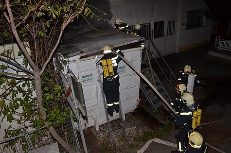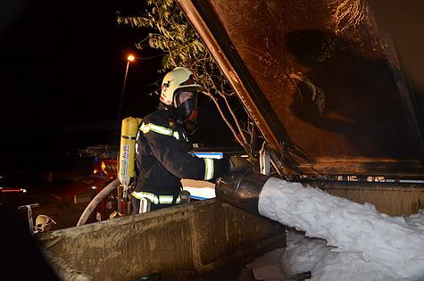 Nachdem ein Übergreifen der Flammen auf benachbarte Objekte verhindert werden konnte, wurde der Container mit Schaum geflutet.