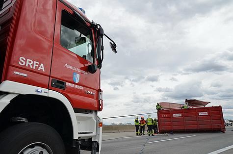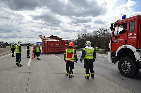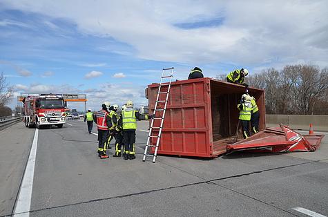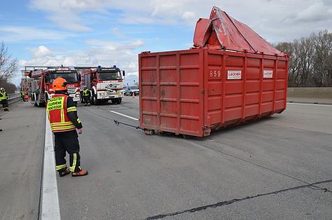 Aus bisher unbekannter Ursache öffnete sich während der Fahrt der Deckel eines auf einem LKW aufgeladenen Stahlcontainers, dieser touchierte einen Überkopfwegweiser und stürzte auf die vier- spurige Autobahn. Wie durch ein Wunder wurde dabei kein anderes Fahrzeug vom Container getroffen bzw. Personen verletzt.