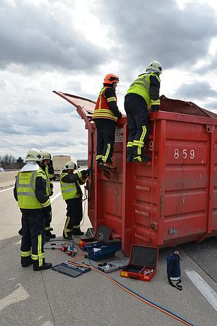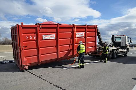 Zuletzt wurde der Stahlcontainer so positioniert. dass dieser vom Trägerfahrzeug wieder aufgenommen werden konnte. Um einen sicheren Abtransport zu gewährleisten, wurde der Verschlussdeckel mittels Zurrgurten gesichert.