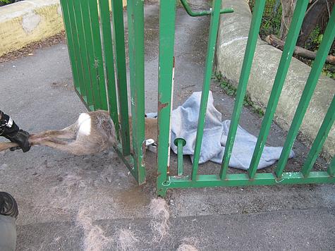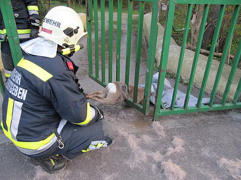 Nach telefonischer Verständigung durch einen Fußgänger rückte die Feuerwehr Kaltenleutgeben am 25. April 2013 zur Tierrettung aus. Ein kräftiger Rehbock steckte direkt neben der Hauptstraße im Gitter eines Gartentores fest. Sofort wurde der zuständige Jagdaufseher über die Bezirksalarmzentrale verständigt, sowie dem schreienden und herumschlagenden Tier eine leichte Decke über den Kopf gegeben.