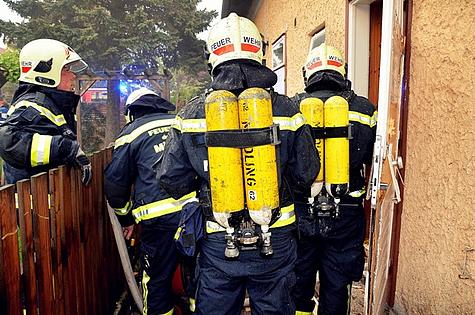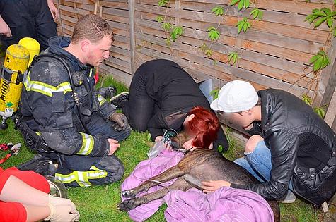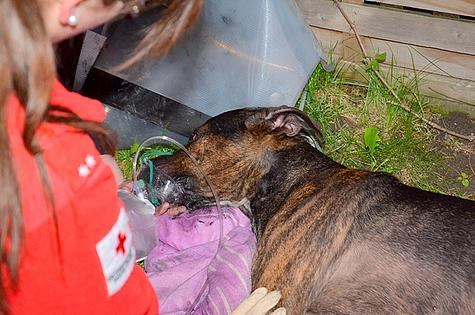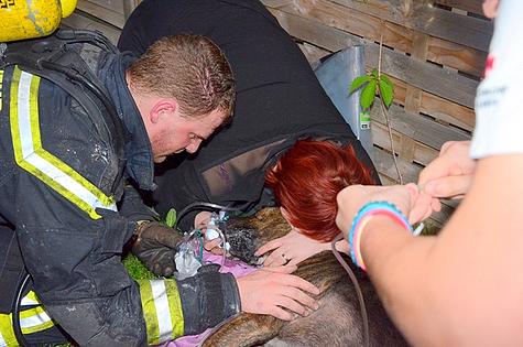 Die Feuerwehrmänner brachten den zweijährigen Dogge-Mischling ins Freie und gemeinsam mit dem Roten Kreuz begannen die Wiederbelebungsmaßnahmen durch eine Sauerstoffeinheit.