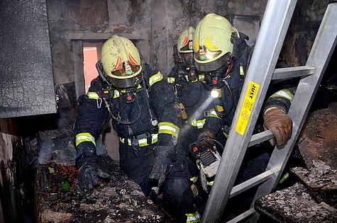 Mittels Wärmebildkamera und Motorkettensäge mussten noch einige Glutnester im Wohnhaus lokalisiert und gelöscht werden.