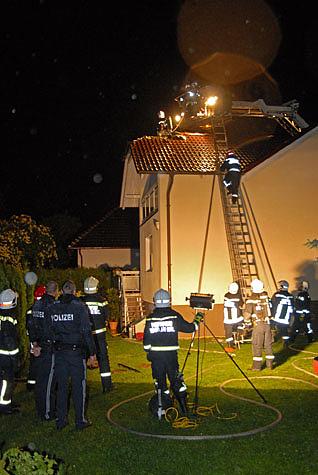 Mit einer Wärmebildkamera konnte das offene Dach auf Glutnester untersucht werden. Ebenso wurden alle Innenbereiche des Hauses kontrolliert. Anschließend wurde das Dach behelfsmäßig mit einer Plane abgedichtet.