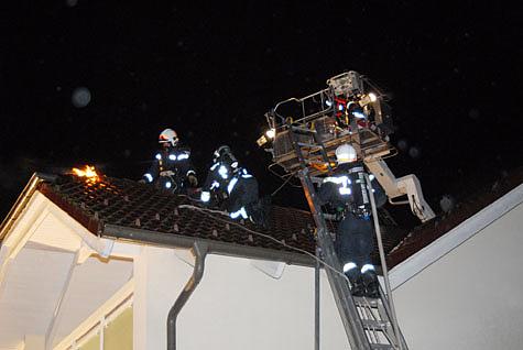 Sofort wurde eine dreiteilige Schiebleiter und ein C-Rohr in Stellung gebracht. Anschließend konnte ein Atemschutztrupp auf das Dach steigen und erste Maßnahmen setzen. Gesichert wurden die Einsatzkräfte über den Steig Brunn.