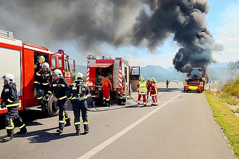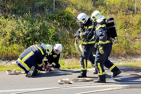 Sofort wurde ein umfassender Angriff mit drei Schaumrohren und 2 C-Rohren gestartet. Aufgrund der starken Rauchentwicklung mussten die Löscharbeiten teilweise unter umluftunabhängigem Atemschutz erfolgen. Während der Löscharbeiten war die gesamte Autobahn, Fahrtrichtung Westen, für eine Stunde gesperrt.