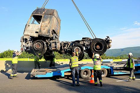 Der teilweise abgebrannte Tieflader wurde durch eine Fachfirma von der Autobahn gebracht. Insgesamt waren 8 Fahrzeuge mit 33 Mann im Einsatz.