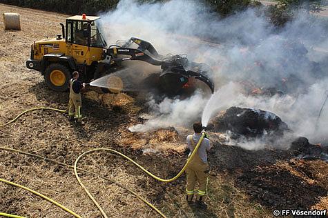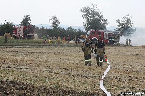 Anschließend wurde von der Marktgemeinde Vösendorf ein Radlader angefordert, um die Strohballen zerteilen und besser ablöschen zu können. Währenddessen wurde die Löschwasserversorgung mit einer 200 Meter langen Zubringleitung sichergestellt.