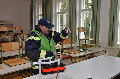 Zur Erkundung innerhalb des Gebäudes rüsteten sich mehrere Atemschutztrupps mit Mehrgasmessgeräten aus und betraten die Schule. Als Erstmaßnahme wurden die Gasleitungen geschlossen, alle Klassenräume kontrolliert sowie mit umfangreichen Lüftungsmaßnahmen begonnen.