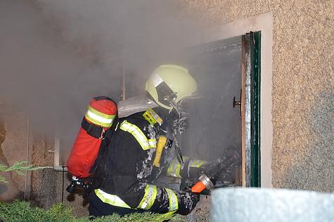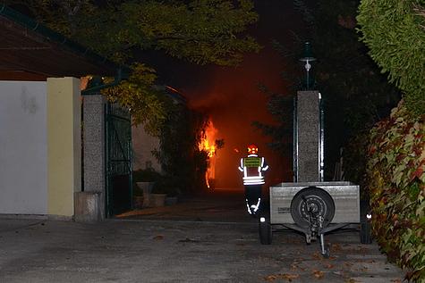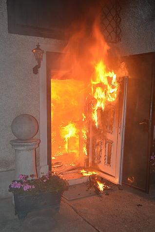 Bei Ankunft des ersten Tanklöschfahrzeuges am Einsatzort schlugen den Feuerwehrmännern bereits meterhohe Flammen aus der Eingangstür des Nebengebäudes entgegen.